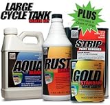 Our "PLUS" Kit contains everything found in our LARGE CYCLE TANK SEALER KIT, "PLUS" a quart of KBS STRIP to quickly remove any old failing sealers previously used to seal your tank. CONTAINS: * Quart of Strip * Quart of AquaKlean * Quart of RustBlast * Pint of Gold Standard Tank Sealer * Nitrile Gloves * Stir Stick * Detailed Instructions