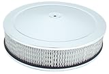 This muscle car air cleaner comes with a high-flow, flame-retardant filter and is round in shape with a plain-style top. It has a 14'' diameter, a 3" height, and a chrome-finished top and zinc-plated base. It fits all carburetors with 5-1/8" necks.
