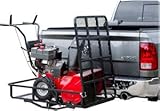 UCC500 Hitch Mounted utility cargo carrier basket designed for hauling lawn mowers, snow equipment, utility gear and more. 5" Clearance from hitch pin hole to cargo carrier basket frame. Mesh cargo basket with a 30"L x 45-1/2"W x 7-1/2"H usable storage area. Works with 2" Class III/IV vehicle hitch receivers. Includes an integrated loading ramp measuring 42-1/2"W x 30"L with upright locking pins. Heavy duty steel construction with a black powder-coat finish. Some assembly is required for installation.