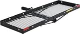Haul luggage and other items on the hitch of your vehicle with a hitch mounted cargo carrier. Features a steel mesh and raised 2-3/4" plate sides. The strong 60" L x 20" W x 3" H hitch carrier conveniently installs behind your vehicle and can support up to 500 pounds cargo. Includes reflective safety stickers. Does not include hitch pin. Limitations of Use: Never exceed the maximum tongue rating of your trailer hitch. Your hauling weight may be limited by your vehicle's suspension to carry a load. Not recommended for hitches less than 12" from the ground to the bottom of the hitch without the use of a hitch riser adapter. Some vehicles may require air shocks or heavier springs to stiffen up the suspension to prevent sagging.