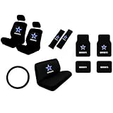 Feel the team spirit of the NFL football season! Support your team in your car with the Dallas Cowboys NFL Auto Interior Gift Set! The Dallas Cowboys NFL Auto Interior Gift Set includes 1 steering wheel cover, 2 bucket seat covers (2 top and 2 bottom), 2 headrest covers, 1 bench seat cover (1 top and 1 bottom), 2 seat belt shoulder pads, and 4 plush carpet floor mats. The simulated leather steering wheel cover provides a soft comfortable grip and fits most standard size steering wheels (14.5 - 15.5 inch.) The steering wheel cover also protects your steering wheel from cracking or peeling. The bucket seat covers are made from 100% Polyester material, and are designed to fit most high and low-backed bucket seats. It can be installed over or under the headrest on vehicles with removable headrests, and some vehicles with armrests may need to have them removed and reinstalled for a semi-custom fit. These front bucket seat covers come with elastic straps and hooks that will snug and secure it under the seat. The shoulder belt pads provide relief from the stress of the seat belts. The floor mats are heavy duty plush thick pile carpet floor mats with licensed NFL logo. Embossed logo makes the design stand out! The backing is made from nipped PVC that prevents sliding and shifting. There is no better way to protect your vehicle's floor while having a bit of fun. The perfect gift for anyone that loves the Cowboys team! Fill your car with the NFL Auto Interior Gift Set today! *WILL NOT FIT SEATS WITH ANY OF THE FOLLOWING: 1. INTEGRATED SEAT BELT. 2. SEATS WITH SIDE AIRBAG. 3. OVERSIZED SEAT (captain seat). 4. SEATS WITH ARMREST (captain seat).* **Note: The seat covers in this set will only fit cars that are passenger sized (compacts, coupes, sedans, etc.) The seat covers will not fit seats in SUVs or Trucks.**