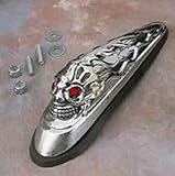The skull head front fender ornament without illuminated eyes (illuminated shown). Easy to install. 2 mounting holes will have to be drilled in the fender and a third hole will have to be drilled for the illuminated eyes wiring . The skull head fender ornament has a beautiful high gloss chrome finish. Metal construction with a black rubber base, allowing it to fit most front fenders. Approximately 6-1/2 inches long by 1-1/2 inches wide by 2 inches tall.