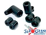 Shogun Complete Kits include matching bar ends, frame sliders and swing arm spools. Shogun sliders are superior to other slider brands by virtue of their construction and material. Shogun pucks, bar ends and spools are made of shatter-proof UHMW infused with UV protective polymer. Shogun sliders absorb kinetic energy from crashes and will not shatter in cold temperature like some types of Delrin or fade in the sun. Each slider has a press fit aluminum bushing (excluding bar ends) to hold it in place during impact to reduce the risk of the slider puck or spool tearing off of the mounting point. Shogun frame slider offsets are CNC machined from the same grade aluminum as military aircraft. Offsets are anodized black to match OEM components. Each offset is manufactured to stringent specifications with ISO 9000 quality control. Each Shogun Frame Slider comes with high tensile strength corrosion resistant hardware (cheap imitators do not use high grade hardware and will quickly rust). Shogun uses socket head bolts in nearly every kit, allowing for stronger frame slider design in a more compact space. Newer applications of Shogun Frame Sliders make use of a counter sunk design, which distributes the force of impact over a wider area and gives additional strength to the system so that the puck remains attached to the motorcycle.