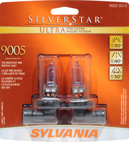 Sylvania's SilverStar Ultra product line of halogen headlight bulbs are the ultimate choice for professionals and do-it-yourselfers who want and/or need to provide the whitest and brightest automotive lighting option possible to vehicles that they are servicing. The SilverStar Ultra 9005SU twin-pack contains two high performance halogen headlight bulbs which feature dramatic improvements over standard halogen bulbs, including up to 50% brighter light, 40% increased down-road visibility and up to 50% increased side-road visibility. The whitest, brightest headlight available. View larger. | | | Why You Should Upgrade to SilverStar Ultra It is an accepted fact that headlights can dim over time by 20% or more. When this dimming occurs, timely replacement of halogen bulbs can instantly increase lighting performance and resulting visibility, but all halogen bulbs are not created equal. The more light you can spread on the road, the better the visibility. With this in mind any driver looking to replace or upgrade their headlights should consider Sylvania's SilverStar Ultra line of halogen headlights bulbs. With a color temperature rated at 4100K (Kelvin), the level of whiteness of the light put out by SilverStar Ultra bulbs is close to that of an approximation of natural daylight at noon (4870K). Their level of brightness, the amount of light able to be reflected in a particular direction(s) or on particular spots, is also exceptionally high. Together these factors make SilverStar Ultra bulbs the whitest and brightest halogen headlights currently available. This increased lighting performance allows for dramatic improvements over standard halogen bulbs in various areas, including up to a 40% increase in down-road visibility, side-road visibility improvements up to 50% and overall increased brightness levels of light up to 50%. The result is a halogen bulb that allows drivers to see farther, wider and more clearly. Combine this with the SilverStar Ultra's D.I.Y. friendly plug and play installation, and you have a product line of bulbs that are a clear choice for any replacement or upgrade project. Key Features: - The whitest and brightest headlight currently available.